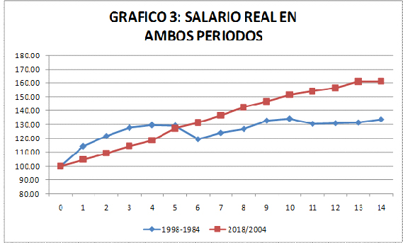 El gráfico 3 nos muestra la diferencia clara en la evolución del salario real en ambos períodos.